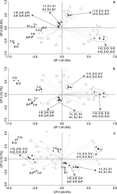 Los resultados obtenidos se sometieron a un análisis de varianza (ANOVA). Se realizó un estudio de estadística multivariada de componentes principales (PCA) sobre el reordenamiento de los datos fisicoquímicos en una matriz de correlación utilizando el programa PAST 4.02 (Hammer et al. 2001).