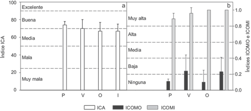 Todo lo expuesto sobre la caracterización del agua se resume en el ICA calculado, ya que los valores observados durante el tiempo de estudio no presentaron diferencias significativas (p > 0.05) y clasifican a las aguas de la LMG en la categoría de calidad media. Los valores del índice ICOMO obtenidos indican un aporte de materia orgánica baja y esporádico durante el año (Fig. 3), que adquiere valores con diferencias significativas (p < 0.05) en primavera/otoño (~ 0.10) respecto de verano/invierno (~ 0.23).