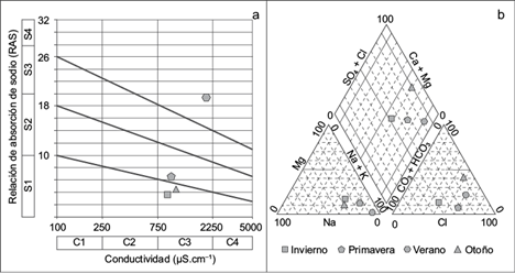 Otro uso potencial de estas aguas es su utilización para riego, ya que al estar la LMG catalogada como reserva urbana, una de las actividades a desarrollar es la de forestación y acondicionamiento de sus alrededores para su adecuado mantenimiento estético. Sin embargo, los resultados obtenidos demuestran que las características del agua de la LMG, cuyo pH estacional es cercano o superior a 9 y su conductividad de aproximadamente 2000 a 3800 µS/cm, no son adecuadas para el riego (Fig. 4a). A partir del diagrama de Piper realizado (Fig. 4b) se observa que los iones principales en su composición química son el cloruro y el sodio, por lo que se clasifica como clorurada sódica. De acuerdo con la clasificación de Riverside (US Salinity Lab Staff 1954), el agua de la LMG se incluye en la categoría S4C4, es decir, con un alto contenido de sodio y excesiva salinidad, por lo que es de muy mala calidad para ser utilizada en riego (Avellaneda et al. 2004). Esta elevada mineralización se observa también en el índice ICOMI calculado (Fig. 3b), el cual mostró valores muy cercanos o iguales a la unidad durante todo el año de estudio, no encontrándose diferencias significativas entre éstos (p > 0.05). De acuerdo con lo propuesto por Ayres y Westcot (1994), la calidad del agua de la LMG se considera como de riego moderado a severo para su uso en riego. Misaghi et al. (2017) estudiaron la calidad del agua para riego del río Ghezel Ozan en Irán, determinando que la misma varía de forma estacional, lo cual atribuyeron a la variación de parámetros como el pH con las condiciones climáticas. Lothrop et al. (2018) relacionaron estos cambios temporales de la calidad del agua de fuentes naturales para riego, con posibles eventos esporádicos de contaminación. Esta situación puede ser la causante de las mencionadas fluctuaciones en el agua de la LMG durante el año de estudio, resultado de la desembocadura de canales pluviales en la laguna.