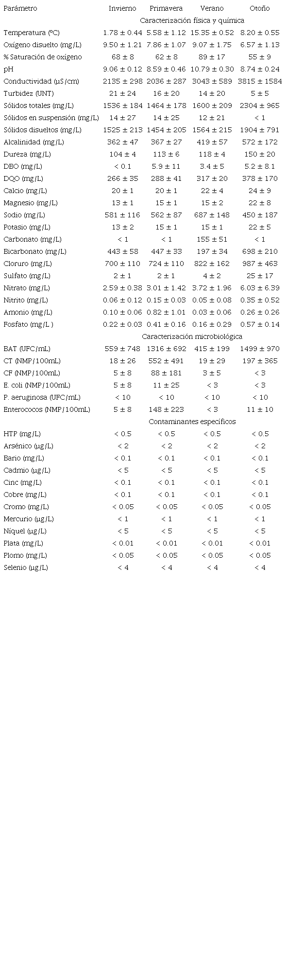 El pH representa el grado de acidez o alcalinidad del agua y, de tal forma, interviene en las formas y procesos químicos e impactos ambientales de numerosas sustancias presentes en la misma (EPA 2013). Además de su importancia para la biota, el pH también es un indicador de contaminación. En LMG el pH se mantuvo cercano a 9 en casi todas las estaciones del año, con la excepción del verano, cuando fluctuó entre valores significativamente mayores de alrededor de 11 (p < 0.05) (Cuadro II). La dinámica temporal del pH puede ofrecer una importante variabilidad estacional e incluso diaria en cursos naturales de agua. La fotosíntesis realizada por organismos acuáticos aumenta el consumo de CO2, causando incremento en el pH. Rubio-Arias et al. (2016) estudiaron esta situación en el lago Colina de la ciudad de Chihuahua, México, y atribuyeron los incrementos de pH observados a la fotosíntesis realizada por algas que se desarrollaron por exceso de volcados de efluentes cloacales. Durante la estación de verano se observó en la LMG el cambio más significativo en la temperatura del agua (p < 0.05) con un valor de 15.35 ± 0.52 ºC. También se encontró la mayor concentración de carbonatos (p < 0.05) y la menor cantidad de bicarbonato cuantificada (p < 0.05) durante el año de estudio. Estos cambios observados en la concentración de carbonatos y bicarbonatos, sumados a una posible disminución del CO2 del agua por un proceso fotosintético, pueden ser los responsables de los altos valores de pH encontrados en la LMG, principalmente en verano (Weiner 2012), ya que la presencia de compuestos nitrogenados (nitrato) y fosforados (fosfato) tienden a estimular los procesos de eutrofización y acelerar el desarrollarlo de organismos acuáticos que pueden realizar estos procesos biológicos.