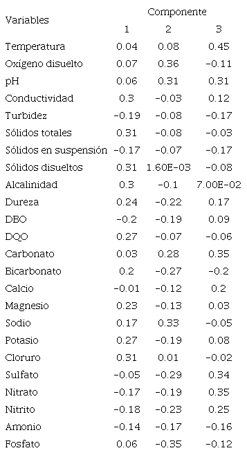 En la figura 2 se presenta el análisis PCA realizado a partir de las características físicas y químicas del agua. En dicho análisis se puede observar claramente la tendencia observada en los datos presentados respecto de que ambas secciones de la LMG poseen características físicas y químicas diferentes, observándose que estas diferencias entre secciones son más acentuadas en verano y otoño. Al analizar la varianza total explicada, encontramos que el primer componente explica el 41.8 % de la varianza, el segundo el 24.4 % y el tercero el 12.7 %, llegándose a obtener con estos tres componentes el 78.9 % de la varianza acumulada. De acuerdo con el cuadro III, las variables más correlacionadas en forma positiva con el primer componente fueron conductividad, solidos totales, sólidos disueltos, alcalinidad, dureza, DQO, bicarbonato, magnesio, sodio, potasio y cloruros, y de forma negativa turbidez, sólidos en suspensión, DBO, nitrato, nitrito y amonio. Las variables más correlacionadas con el segundo componente de manera positiva fueron oxígeno disuelto, pH, carbonato y sodio, y de forma negativa dureza, DBO, bicarbonato, potasio, sulfato, nitrato, nitrito, amonio y sulfato. Respecto del tercer componente se correlacionaron positivamente temperatura, pH, dureza, carbonato, calcio, sulfato, nitrato y nitrito, en tanto que de forma negativa la turbidez, sólidos en suspensión y amonio. De lo anterior puede inferirse que los tres componentes presentados agrupan a los sitios de muestreo en función de su contenido de sales y de materia orgánica, ya que éstas fueron las variables de mayor peso en su construcción. De esta manera quedan en evidencia los problemas que pueden ocasionar las descargas de los efluentes pluviales en los cuerpos de agua estudiados.