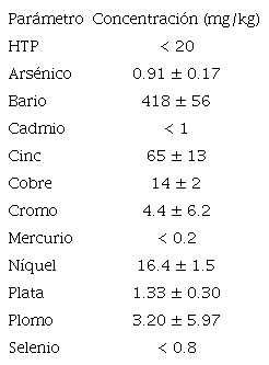 La determinación de hidrocarburos totales del petróleo (HTP) se realizó en las muestras de agua por aplicación del método EPA 418.1 (US-EPA 1978), y en las de sedimento por aplicación del método EPA 3550C/418.1 (US-EPA 2007, US-EPA 1978).