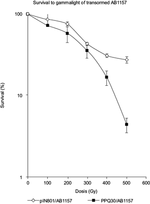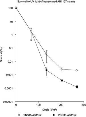 Survival of the transformed bacteria with radA from both PQ30 and IN801 was then evaluated for UV and gamma radiation. Since the insertion of radA took place in a site controlled by an operator of the gen lacZ, it was necessary to incubate the cells in the presence of IPTG. Figures 1 and 2 show a significant difference in survival between the two types of AB1157 transformants to both UV and gamma radiation, suggesting that radA from IN801 confers more radiation resistance to this strain.