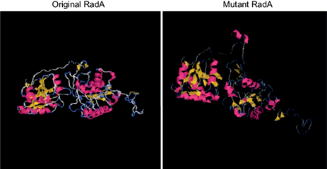 By DNA sequencing, two base substitutions were found in radA of IN801. In both cases the substitutions were T for C replacing alanine for valine and proline for leucine in the positions 218 and 267 of protein RadA (Table II). Tridimensional modeling of mutant RadA protein by means of the I-Tasser server (Zhang 2008), shows structural differences from the original protein (Fig. 3).