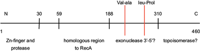 Bacterial radA is a paralog of rec A and therefore both genes have some similarity. However, the RadA protein cannot carry out the step of strand exchange during homologous recombination or recombinational repair, a step exclusively catalyzed by RecA (Cooper and Lovett 2016). RadA protein possesses 4 well-defined domains that confer different enzymatic activities (Fig. 4). In the N-terminal domain is a putative Zinc finger similar to the zinc fingers of other DNA repair enzymes. A second domain shows homology with RecA, including the Walker A and Walker B boxes typical of ATPase’s. Next is a region known as KNRFG that exhibits a strong homology with the gene 65 of the mycobacteriophage D29, whose product has been shown to act as a DNA exonuclease that removes 3’ strands from forked structures leaving 5’ overhangs (Giri et al. 2009). Finally, the C-terminal region has some similarity to the bacterial Lon protease.