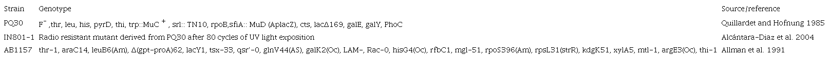 Escherichia coli can efficiently repair its genetic material (DNA) from damage induced by natural UV light or gamma radiation (Piette 1990, Livneh et al. 1993). However, the survival of this bacterium increases after repeated or chronic irradiation, indicating that the repair or protection of its genome was improved by a process of mutation and selection (Ewing 1995, Goldman and Travisano 2011, Byrne et al. 2014, Bruckbauer et al. 2019). In a previous work in which E. coli PQ30 was treated with 80 growth-irradiation cycles of UV light (254 nm), a derivative strain resistant to UV and gamma radiation designated as IN801 was isolated (Alcántara-Díaz et al. 2004). The UV resistance of this mutant, as determined by the survival at a dose of 100 J/ m2, increased more than 100 times when compared with the parent strain.