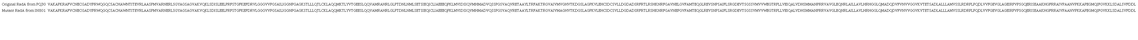 Amplified radA from both PQ30 and IN801 were sequenced by Sanger’s method using the BigDye v3.1 kit (Applied Biosystems) and the ABI310 sequencer. The number of the radA sequence against which the mutated gene was compared is EG11296. The amino acid sequences were determined by the EMBOSS-Transeq facility from The European Bioinformatics Institute (EMBL-EBI; http://www.ebi.ac.uk). Nucleotide and amino acid sequences were compared by means of the CLUSTAL W program and predictions of 3D protein structures were obtained by means of the I-Tasser server (Zhang 2008, Ambrish et al. 2010, Jianyi et al. 2015, Yang and Zhang 2015).