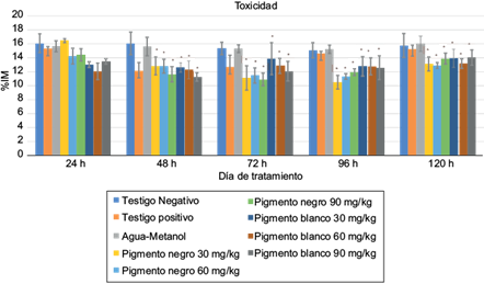 Con el fin de evaluar el comportamiento tóxico de ambos pigmentos a dosis de 30, 60 y 90 mg/kg, se llevó a cabo la prueba de ANOVA para cada día (24, 48, 72, 96 y 120 h). Además, se evaluó si el medio agua-etanol en que se disolvieron los pigmentos también provocaba toxicidad (Fig. 1).