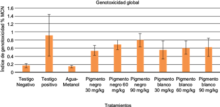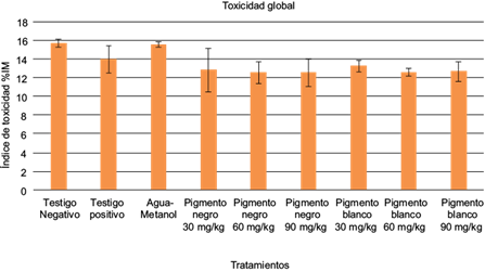 Por último, se realizó un análisis estadístico que contempló los cinco días de muestreo para observar el resultado global (Fig. 2). Los valores promedio del efecto toxicológico (Cuadro I) evaluados de manera global mostraron un valor calculado de Fobs = 6.46 > = 2.313, es decir, los valores promedio de los tratamientos presentaron diferencias significativas con relación a la proporción de células policromáticas y normocromáticas. La prueba de comparación múltiple de Dunnett (p < 0.05) indicó que los tratamientos expuestos a pigmentos fueron los que mostraron diferencias significativas.