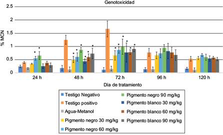 A las 48, 72, 96 y 120 h (Fobs = 22.24 > = 2.313; Fobs = 19.88 > =2.313; Fobs = 16.62 > = 2.313, y Fobs = 35.98 > = 2.313, respectivamente), los valores de la prueba de ANOVA indicaron la existencia de diferencias estadísticamente significativas. Mediante la prueba de Dunnett (p < 0.05) se puntualizó que todos los tratamientos con los pigmentos, a excepción del grupo tratado solamente con agua-etanol, generaron un aumento significativo de micronúcleos respecto al control negativo.
