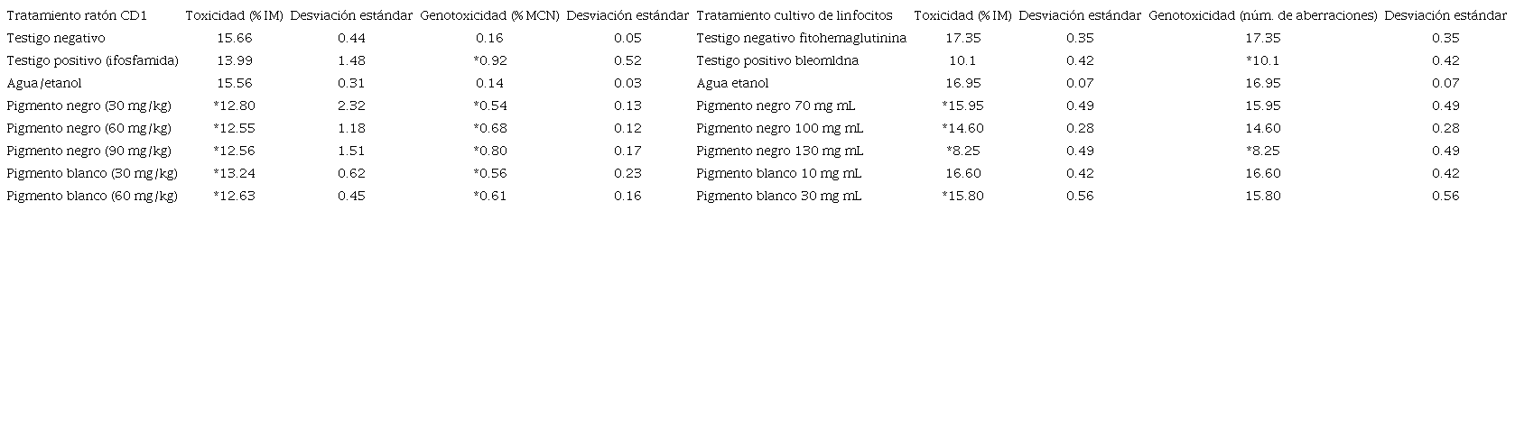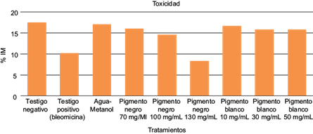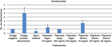 En el caso de los cultivos de linfocitos humanos expuestos a concentraciones de tinta negra y tinta blanca, los tratamientos tuvieron un efecto citotóxico al disminuir las células en división; sin embargo, ninguno incrementó de manera significativa la generación de aberraciones cromosómicas.