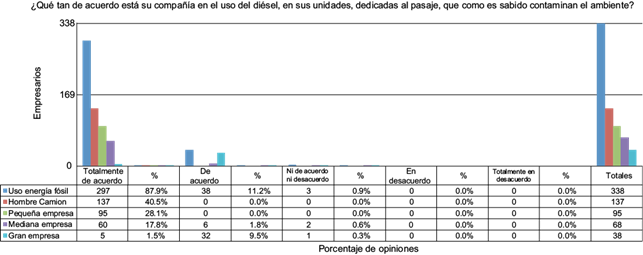 Posteriormente se conjuntaron opiniones sobre las diversas preguntas que en resumen fueron: energía fósil (diésel), monitoreo de CO2, inversión y migración a tecnologías verdes, responsabilidad social, mentalidad sobre el ambiente, biodiésel, energía solar, energía eólica, energía híbrida o totalmente eléctrica, gas natural, hidrógeno, ley sostenible sobre el autotransporte de pasajeros y tendencias internacionales del sector. El resultado fue el porcentaje de cada uno de los valores de las cinco categorías Likert de acuerdo con la frecuencia de las respuestas; la medición de los datos se realizó con el programa Microsoft Office Excel, Windows 7, a través de la siguiente fórmula: