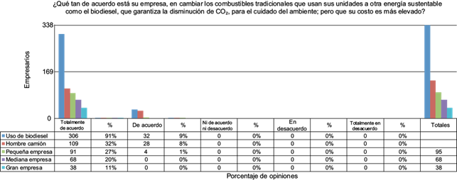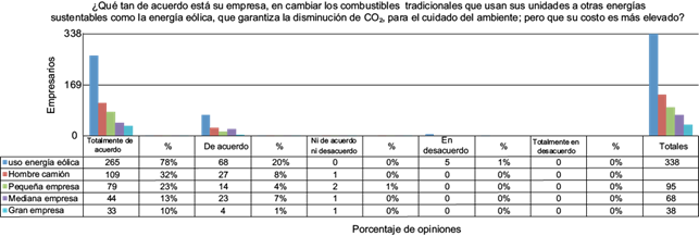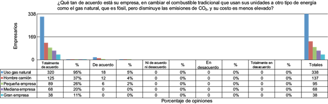 En la figura 10, se muestra que el 100 % de los empresarios están a favor de que sus flotas utilicen gas natural; saben que su costo es más económico que el del diésel y que las emisiones disminuyen considerablemente; piensan que es lo más inmediato que debe usarse a favor de la sostenibilidad, ya que los costos para convertir sus unidades no son tan elevados. Cabe mencionar que algunos de estos empresarios ya han convertido sus camiones, aún a sabiendas de que es un combustible fósil.. Existen compañías armadoras que ya desarrollan unidades con este tipo de energía, lo que justifican explicando que su composición molecular es más simple que la de una molécula de diésel; por esto es más fácil su combustión y se generan menos emisiones contaminantes. Al comparar un motor diésel (EPA 2004) con uno de gas natural comprimido (EPA 2010) se observa que con el gas natural se reduce en más del 95 % la emisión de partículas y en más del 90 % la de óxidos de nitrógeno (NOx). Asimismo, también se reduce el ruido: 10 motores de gas natural comprimido producen el ruido equivalente de un motor de diésel. En cuanto a la viabilidad económica, aún sin los subsidios gubernamentales como los que tienen el diésel y la gasolina, el ahorro en el costo del gas natural, comparado con el diésel convencional, puede ser alrededor del 35 %. En seguridad, el gas natural no es tóxico y es más ligero que el gas LP, se disipa rápidamente en caso de fuga; los cilindros, válvulas y tubería que se instalan en el autobús cumplen con normas internacionales de seguridad. Actualmente el gas natural es considerado como la fuente de energía más limpia y respetuosa con el ambiente por lo que ocupa el tercer lugar en el mundo entre las fuentes de energía primaria más utilizadas después del petróleo y el carbón (Acevedo et al. 2013).