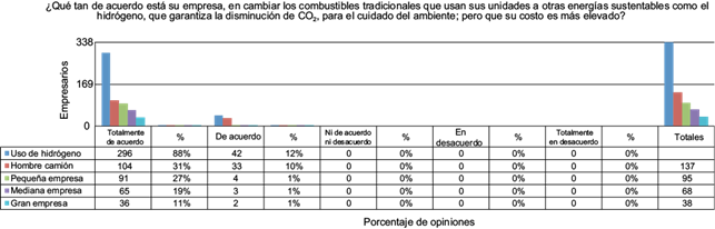 En la figura 11, se observa que el 100 % de los empresarios favorecería el uso del hidrógeno; les interesa que ese tipo unidades se construya en México, sin embargo, a corto y mediano plazos ven difícil su uso en el transporte. Quintero y Nova (2013) mencionan que este tipo de energía representa grandes ventajas desde la perspectiva ambiental, la más importante es el hecho de que la combustión del hidrógeno no contamina. Existen dos razones principales por las que es deseable sustituir los combustibles fósiles por el hidrógeno: 1) la combustión del hidrógeno sólo produce como subproducto agua, mientras que los combustibles fósiles liberan CO2 que se fija en la atmósfera y es uno de los mayores responsables de lo que se denomina “efecto invernadero” y 2) las reservas de combustibles fósiles se agotarán tarde o temprano, mientras que el hidrógeno permanecerá inagotable.