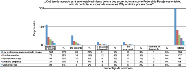 De acuerdo con lo que se muestra en la figura 12, el 82 % de los empresarios respondieron a favor de establecer la ley sobre autotransporte federal de pasajeros sostenible. Mencionaron que de alguna manera ya existe, al estar obligados los fabricantes de motores a cumplir con las normas del ambiente (EPA y EURO vigentes) sobre óxidos de nitrógeno (NOx), y partículas (PM), además de la Norma Oficial Mexicana NOM-167-SEMARNAT-2017 que establece los límites máximos permisibles de emisión de contaminantes para los vehículos automotores que circulan en entidades federativas como Ciudad de México, Hidalgo, Estado de México, Morelos, Puebla y Tlaxcala, así como los métodos de prueba para la evaluación de dichos límites y las especificaciones de tecnologías de información y hologramas (DOF 2012). Otros empresarios manifestaron que es acertado el establecimiento de esta ley, que marcaría el principio hacia la sostenibilidad forzosa del ramo y con ello habría mayores oportunidades de apoyo gubernamental, y un fortalecimiento regulatorio. Consideraron que se tendría que ayudar a las dos figuras empresariales más vulnerables (hombre camión y pequeña empresa). La promulgación de nuevas normas para vehículos más eficientes y el uso eficaz de la energía ayudará al país a cumplir su compromiso climático (Núñez et al. 2015).