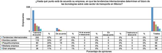 Como se ve en la figura 13, el 100 % de los empresarios está a favor de que las tendencias internacionales determinen el futuro del sector en México, pues es uno de los factores indispensables para la transferencia de tecnología. Ésta se ha logrado gracias a la globalización y han podido entrar más compañías armadoras con diferentes tipos de camiones, de los cuales ellos pueden elegir los que más les convenga. Un ejemplo es cómo el transporte y la circulación de vehículos en Norteamérica fueron gestados por largos intercambios comerciales y culturales entre las naciones de la región y que con el TLCAN se profundizaron (Camarena 2014). Sin embargo, el que México sea un país globalizado con 12 tratados de libre comercio con 46 países, puede ser un arma de dos filos: por un lado se tiene la oportunidad de compartir experiencias e intercambiar tecnologías con cualquiera de estos países en este ramo; pero por otro lado se corre el peligro de que México se convierta en un importador de tecnología y conocimiento, quedando en desventaja. No debemos olvidar que el fin primordial es encontrar mecanismos de mitigación o una estrategia sostenible que ayude a frenar el cambio climático y se lleve a cabo la Agenda 2030 para el Desarrollo Sostenible. Esto implica la consecución conjunta de diferentes objetivos, en particular, avanzar en el crecimiento económico y en el desarrollo social y ambiental, para lo cual es fundamental lograr el pleno empleo, promover la industrialización inclusiva y fomentar la innovación, considerando los efectos sobre el cambio climático y los impactos ambientales (CEPAL 2016). Lo anterior, especialmente en la industria del transporte, en la que en los actores del sector deberán buscar la estrategia sostenible, con resultados en beneficio del ambiente y a favor del uso de energías alternativas y limpias, diferentes a la fósil.