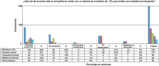 En la figura 2, se observa que el 69 % de los empresarios están a favor de contar con un sistema de monitoreo de CO2, aunque algunos manifestaron su preocupación por la falta de recursos económicos, ya que sus unidades no son nuevas y creen que esto puede ser negativo para su compañía. Proponen que se les otorgue apoyo económico gubernamental para poder cumplir con este objetivo y llegar a realizarlo con la mejor eficiencia operativa, tecnológica y de bajas emisiones. Sin embargo, como menciona Núñez (2015) el sistema por el que las empresas obtendrían beneficios al intentar reducir las emisiones nunca ha llegado a tomar forma, el gobierno aún no ha estudiado esta posibilidad de apoyo hacia sistemas de monitoreo que deberían ser parte integral de estas unidades de transporte.