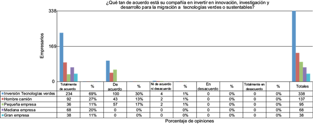 El 99 % de los empresarios (Fig. 3) están a favor de invertir en innovación, investigación y desarrollo para la migración a tecnologías verdes o sostenibles. Las categorías hombre camión y empresa pequeña manifestaron no tener recursos suficientes para ello. La Comisión Económica para América Latina y el Caribe (CEPAL 2016) menciona que hay empresas con departamentos exclusivos para la innovación tecnológica, con grandes inversiones en investigación y desarrollo (I+D) y que en las pequeñas empresas el impacto ambiental debe incorporarse al proceso general de mejora de la productividad y la competitividad.
