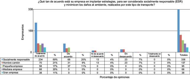 Como se puede observar en la figura 4, el 89 % de los empresarios están a favor de implantar estrategias para que sus compañías sean consideradas socialmente responsables y minimizar daños al ambiente. Manifestaron que mejorarán en la medida de lo posible sus chasises y carrocerías, para asegurar la vida útil de sus vehículos en beneficio de sus clientes; además de generar un impacto social positivo a través de la cooperación entre los transportistas, gobierno y ciudadanía para mejorar su contexto. Es importante, como mencionan Chirinos et al. (2013), que las empresas socialmente responsables sean organizaciones inteligentes que comprendan el valor del bien común y no conciban otra forma de desarrollo que no sea la sostenibilidad; la ética debe ser la guía para hacer las cosas bien, pero hay que ir más allá, para retribuir al entorno y a la sociedad los beneficios obtenidos.