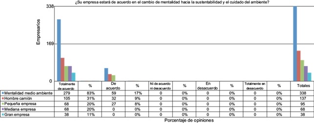 El 100 % de los empresarios están a favor de cambiar su mentalidad hacia la sostenibilidad y el cuidado del ambiente (Fig. 5) y está preocupado por ello, sin embargo consideran a la crisis económica actual como el principal impedimento para las inversiones; aunque aseguraron que buscarán la forma para que desde sus diversas operaciones poco a poco vayan cambiando hacia buenas prácticas sostenibles y logren alinear sus objetivos, misión y visión independientemente del combustible que usan sus unidades. Estiman, como mencionan Roa y Pescador (2016), que es necesario plantear medidas para proteger la salud y promover la toma de conciencia, sensibilizándose ante los eventos de alteración de los factores ambientales. Asimismo, que también es necesario proponer investigaciones científicas que evalúen riesgos potenciales con el fin de planificar estrategias de adaptación y mitigación. En definitiva, se comprometieron a evolucionar desde el transporte urbano y foráneo a mediano y largo plazos y esperan pronto el uso de combustibles alternativos y energías limpias.