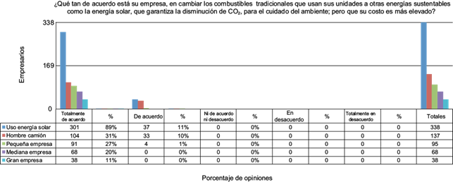 En la figura 7, se muestra que el 100 % de los empresarios estuvo de acuerdo con el uso de la energía solar; en México la radiación solar es una fuente inagotable que pude ser aprovechada. Como menciona Trejo (2011) ésta aporta el mayor flujo de energía en los ecosistemas terrestres; se calcula que alrededor de 100 000 tera watts (1 TW = 1012 watts) inciden sobre la superficie del planeta al año. De tener la capacidad para aprovechar la energía solar que se recibe en un año, considerando que la demanda energética global en ese mismo lapso es de alrededor de 16 TW, esta aseguraría el contar con más de 6000 veces los requerimientos actuales de energía de nuestra civilización. Hay países donde ya se está aprovechando este tipo de energía en el autotransporte, como en Adelaida, Australia, que es el primer país del mundo en poner en sus calles autobuses con energía solar, montando en el techo placas fotovoltaicas subvencionadas por el estado. Con una fuerte radicación solar, las placas producen el 70 % de la energía necesaria para el funcionamiento de los autobuses (Adelaida Buscompany 2019) el otro 30% proviene del sistema de frenado (EcoInventos 2016). Este ejemplo, podría ser un prototipo mundial para ser duplicado en México.