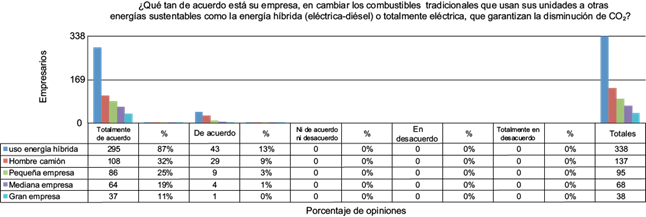En la figura 9, es evidente que al 100 % de los empresarios le gustaría usar la energía híbrida (eléctrica-diésel) o totalmente eléctrica; opinaron que estos camiones pronto serán adquiridos en México y serán los que sustituyan a los actuales; solicitan apoyo gubernamental para poder comprarlos. Se sabe que mediante esta tecnología se elimina gran parte la emisión de contaminantes atmosféricos; un ejemplo es la Ciudad de México, donde diariamente se realizan más de 6 millones de viajes en los 25 000 autobuses de la red de transporte público. La renovación de la flota con alternativas de electromovilidad ofrece una oportunidad única para el ambiente, pues en un año un autobús híbrido disminuye la emisión de 30 toneladas métricas de CO2, mientras que uno eléctrico usando energía renovable puede reducir hasta 90 toneladas. En este sentido, si bien se prevé que para 2030 los viajes en autobús aumenten cerca de 50 % y con esto se reduzca el uso de autos privados en las ciudades, lo cierto es que ese hecho por sí solo no garantiza la disminución de emisiones, pues los autobuses viajan hasta 10 veces más lejos que otros vehículos de pasajeros, generando mayor impacto ambiental especialmente cuando no tienen buen mantenimiento o necesitan ser renovados (García 2016).