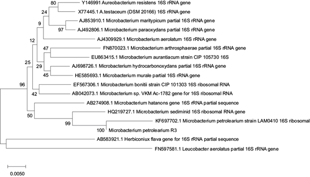 The resulting phylogenetic tree showed a similarity of 100 % with the Microbacterium petrolearium strain R3 and the M. petrolearium strain LAM0410; in other words, both strains belong to the same species. This association is followed by a similarity of 99 % with Microbacterium sediminis YLB-01 as a close species, and it establishes itself as a group external to Herbiconiux flava and Leucobacter aerolatus (Fig. 1).