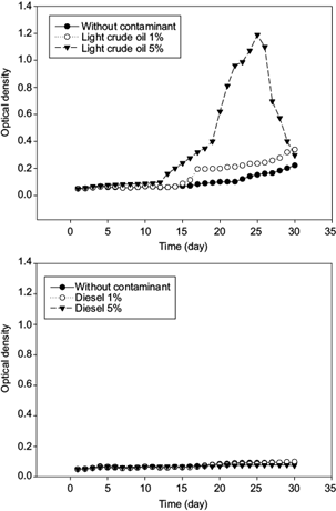 As seen in both graphs, Microbacterium petrolearium R3 shows minimum growth in the absence of either of the two contaminants. In the case of light crude oil, a slight increase in growth is seen at 1 % after 15 days of incubation; however, when the 5 % concentration is used, the growth increase is greater. When evaluating diesel using the concentrations of 1 and 5 %, growth is not observed in comparison to the growth seen with light crude oil. In contrast, growth inhibition is seen with the concentration used; that is, at a higher percentage of the contaminant, there is a greater growth inhibition of M. petrolearium R3.