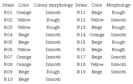 After 48 h of incubation at 30˚ C, colonies were selected according to morphology, color, texture, and size. These were spread onto Petri dishes with PY culture medium until pure isolates were obtained. A total of 17 pure isolates were obtained; their characteristics are listed in table I.