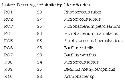 Ten isolates were sequenced according to their different enzyme digestion patterns. Once acquired, alignment results performed with BLAST allowed the identification of bacteria, as shown in table II. The R3 strain was identified as Microbacterium petrolearium (Table II).