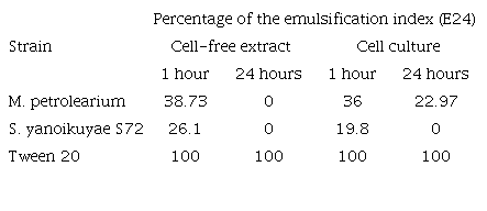 The percentage of the emulsification index after 1 h was 38.73 % for Microbacterium petrolearium R3 and 26.1 % for Sphingobium yanoikuyae S72 in the cell-free extract, and 36 % for Microbacterium petrolearium R3 and 19.8 % for Sphingobium yanoikuyae S72 in the cell culture. After 24 h of incubation, none of the strains presented emulsification in the cell-free extract; however, in the cell culture, the only strain that presented emulsification in 22.97 % was Microbacterium petrolearium R3 (Table III).