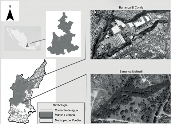Para efectos comparativos, se evaluó también una barranca con características similares a El Conde en cuanto a tipo de ecosistema y grado de diversidad específica: la barranca Malinalli, que se encuentra hacia el sur de la ciudad (Fig. 1) en las coordenadas 18º 93’ 93” N y 98º 13’ 68” O, con una longitud aproximada de 750 m y una profundidad que varía desde 1.30 hasta 15 o 20 m. En cuanto a su anchura, también varía desde 8 m en los sitios más estrechos hasta 50 m en los más amplios. Malinalli tiene características ecosistémicas similares a las de otras barrancas de la periferia de la ciudad donde aún no llega plenamente la mancha urbana; por lo mismo, no presentan de manera evidente los impactos antrópicos que afectan a El Conde. Además, es accesible en tanto que se encuentra dentro de uno de los campus de la universidad estatal.