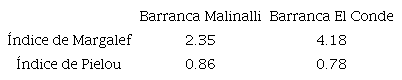 Se propuso realizar un análisis de la biodiversidad a nivel de especies (patrones de diversidad alfa), ya que permite dar cuenta del estado sistémico y funcional del ecosistema de las barrancas, con o sin impactos antrópicos evidentes. La estimación se realizó con los índices de Margalef (Dmg ) y de Pielou (J’), mediante las ecuaciones 1 y 2 (Franco 1992, Magurran 2004). El índice de Margalef se basa en la riqueza específica y el de Pielou en la estructura de la comunidad (abundancia relativa de individuos, la cual determina la importancia de cada especie). Este último es un índice de equidad cuyo planteamiento teórico se sitúa en la uniformidad que tienen las especies en el sitio de estudio (Moreno 2001).