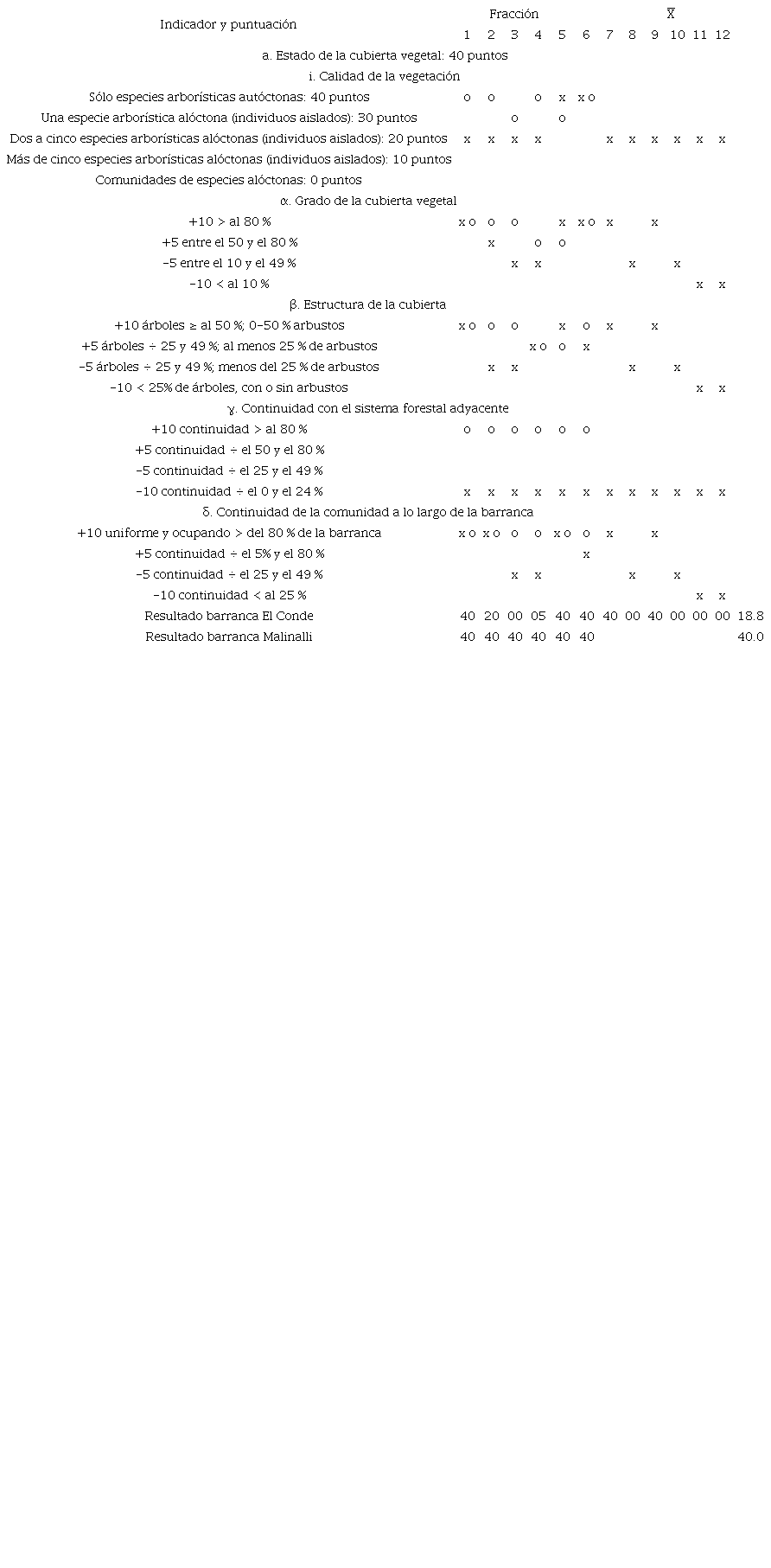 La calificación que otorga a las barrancas el indicador compuesto se obtiene de la siguiente manera: el indicador simple Calidad de la vegetación aporta una calificación a la fracción de barranca correspondiente que puede ser de 0, 10, 20, 30 o 40 puntos. Los otros cuatro indicadores (Grado de la cubierta vegetal, Estructura de la cubierta, Continuidad con el sistema forestal adyacente y Continuidad de la comunidad a lo largo de la barranca) pueden o no modificar la calificación base aportada por el indicador Calidad de la vegetación. Las modificaciones pueden hacerse en puntajes de -10, -5, +5 y +10. El resultado final para cada fracción evaluada no puede ser mayor de 40 puntos ni menor de 0. La calificación total para el indicador compuesto Estado de la cubierta vegetal es la media aritmética de los valores de las fracciones evaluadas.