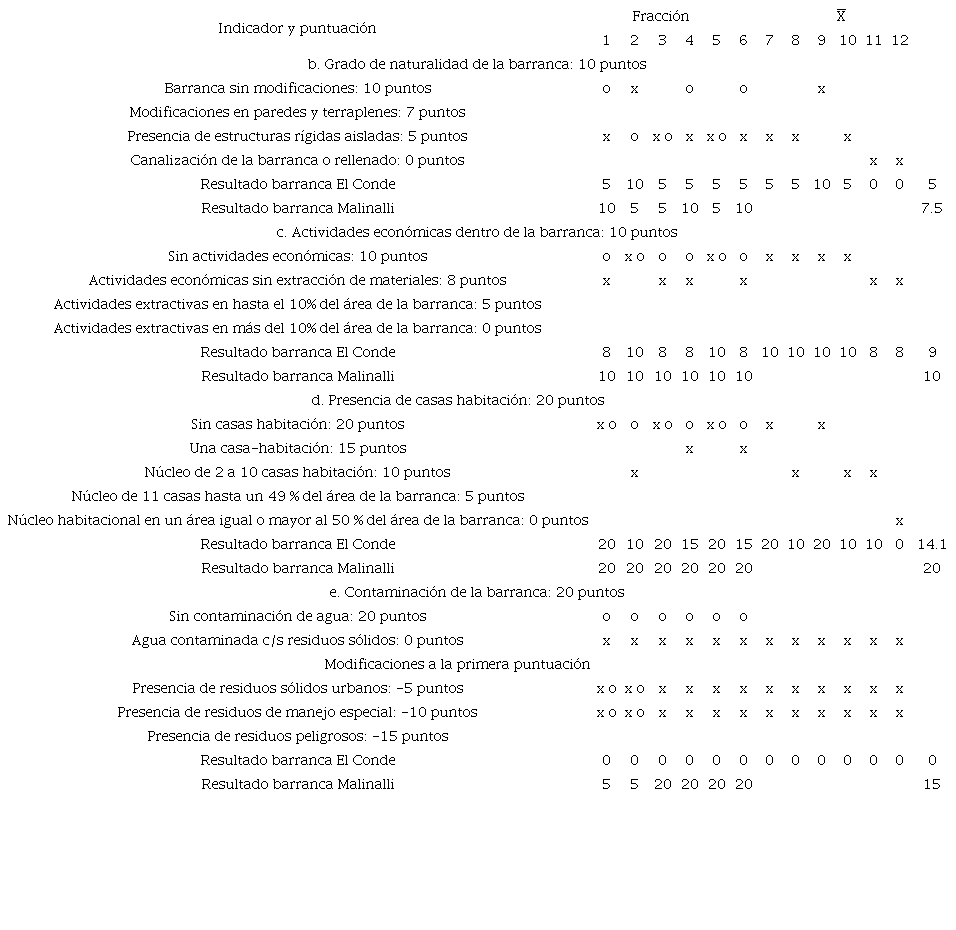 Como ejercicio comparativo, la evaluación de las barrancas con el índice QBR hubiese arrojado un valor de 42 puntos para la barranca El Conde y 87.5 para la barranca Malinalli, que corresponden a una mala calidad (alteraciones fuertes) en el primer caso y a una buena calidad (bosque ligeramente perturbado) en el segundo (Munné et al. 2003). Estos resultados contrastan con los del indicador compuesto de la propuesta de este trabajo: Estado de la cubierta vegetal (18.8 y 40 puntos de 40 máximos, respectivamente, equivalentes a 47 y 100 puntos en una escala de 0 a 100 puntos). La calificación otorgada por este indicador compuesto es superior para ambas barrancas, sobre todo en Malinalli, en la medida en que sólo califica aspectos de la cubierta vegetal, mientras que el índice QBR incluye variables como presencia de estructuras rígidas y basura que modifica algunos de sus cuatro componentes.