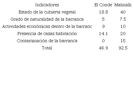 En el cuadro V se muestran las puntuaciones totales para las barrancas, que corresponden a una calidad pobre para la barranca El Conde y excelente para la barranca Malinalli. Estos resultados permiten conocer, de manera general, el estado ecosistémico de las barrancas. En el caso de la barranca El Conde, el resultado pone en entredicho su continuidad al encontrarse en grave deterioro y riesgo, lo cual podría derivar en una grave pérdida para la ciudad en tanto que aún es un activo ecológico importante dada su riqueza y nivel de diversidad específica.