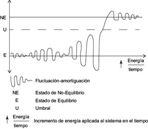 Para que se forme una estructura disipativa, en principio, se tienen unas condiciones de equilibrio (sean cuales sean éstas) en el que se producen fluctuaciones respecto de dichas condiciones que con el paso del tiempo se amortiguan (Fig. 1). Si se va aportando energía, las fluctuaciones van siendo más grandes pero el sistema aún consigue amortiguarlas. Hasta que llega un momento en el que se sobrepasa un umbral. La fluctuación ya no se amortigua, sino que se estabiliza en un estado alejado del equilibrio primitivo, pero igualmente estable mientras continúe el aporte de energía: se ha formado una estructura disipativa (Manríquez 1987).