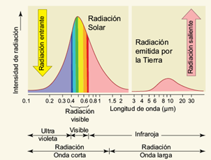 El sistema Tierra-atmósfera intercambia radiación con el espacio, lo cual conduce y mantiene casi todos los procesos dentro de este sistema. Según Liu (Liu et al. 2011), la esencia del intercambio de radiación de la Tierra con el espacio es que los fotones de alta energía con baja entropía provenientes del Sol, ingresan al sistema Tierra-Atmósfera (Stephens y O’Brein 1993, Liu et al. 2011), y los fotones de baja energía con alta entropía son emitidos desde el sistema Tierra-Atmósfera al espacio, lo que se muestra en la figura 2. Obsérvese, además, que en ninguna parte de esta figura se señala la cantidad de radiación ni tampoco cuál es más importante, más bien, indica en qué región la radiación es más intensa. En general, el sistema Tierra-atmósfera puede pensarse como un sistema multicuerpo que es cerrado al intercambio de material que no sea de radiación y abierto a intercambio de radiación con el espacio. Para semejante sistema complejo, el flujo neto de entropía que resulta del intercambio de radiación restringe la proporción de producción de entropía interna del sistema Tierra-atmósfera, una medida fundamental de todas las actividades dentro de este sistema, que incluye procesos oceánicos, atmosféricos y biológicos (Katchalsky y Curran 1965, Glansdorff y Prigogine 1971, Mahulikar y Herwig 2009, Torday 2016, Haddad 2017).