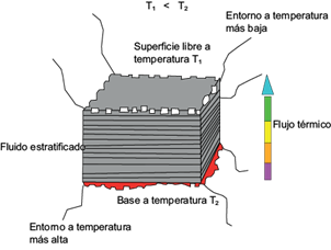 En 1900, investigaciones de Bénard (Bénard 1900, 1901) en fluidos delgados y estratificados, originalmente en reposo, con una superficie libre a baja temperatura, T1, la que es calentada desde la base con una temperatura alta, T2, le hicieron notar un patrón regular de celdas convectivas hexagonales, las que se organizaban abruptamente cuando la diferencia de temperatura (T2-T1) alcanzaba el umbral de inestabilidad primaria (De Groot y Mazur 1962, Glansdorff y Prigogine 1971, Eckert et al. 1998), sugiriendo que cada sistema que obtiene calor de un entorno a una temperatura más alta perderá calor en un entorno a una temperatura más baja, experimentando un cambio neto de entropía negativa o neguentropía, tal como se ilustra en la figura 3 (Liu et al. 2011). En este caso, el cambio de entropía (δSe) de un estado de equilibrio a otro estado -también de equilibrio-, cuyo proceso es irreversible está dado por (Dewar 2005):