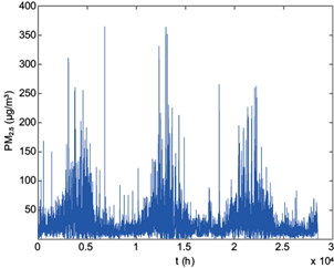 Las series de tiempo de concentraciones horarias de contaminantes y variables meteorológicas fueron recopiladas desde la Red MACAM III, mantenida por el Sistema de Información Nacional de Calidad del Aire (SINCA) dependiente del Ministerio del Medioambiente de Chile (MMA), desde el año 2010 hasta el año 2013. Esto corresponde a 3.25 años o 39 meses. Las variables de contaminación fueron PM10, PM2.5 y CO. A su vez, las variables meteorológicas consideradas fueron temperatura (T), humedad relativa (HR) y magnitud de la velocidad del viento (VV). En total, son 28 464 datos por cada variable. En el cuadro I se muestra la estadística descriptiva para PM2.5. Las estaciones de monitoreo que se usaron en este estudio fueron seis: La Florida (EML), Las Condes (EMM), Santiago-Parque O’Higgins (EMN), Pudahuel (EMO), Puente Alto, (EMS) y Quilicura (EMV) (Fig. 4). En figura 5 se puede observar la serie temporal para la estación Pudahuel (EMO), durante el período en estudio. Las otras estaciones presentan gráficas similares.