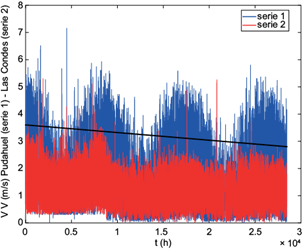La figura 6 muestra la evolución temporal del régimen de magnitudes de velocidad del viento en función del tiempo, en las estaciones de monitoreo de Pudahuel (EMO, fondo de valle, serie 1) y Las Condes (EMM, pie de montaña, serie 2). Estas decaen (línea negra) para el periodo de tiempo en estudio, indicando un espacio geográfico menos ventilado. Se puede observar claramente la estacionalidad anual del viento durante el período en estudio.