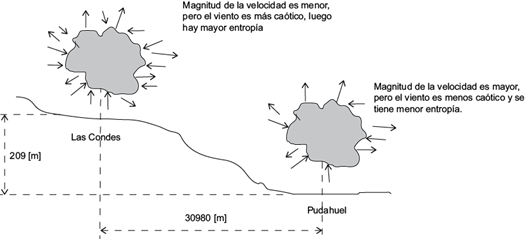 Desde una perspectiva esencialmente entrópica, por los órdenes de magnitud de las entropías de las dos localidades, se favorece el natural flujo de entropía desde la alta entropía de EMM a la baja entropía de EMO, flujo claramente neguentrópico (SK, FINAL - SK, INICIAL < 0). Esto es favorecido por la configuración geográfica y las variables meteorológicas en Santiago de Chile. El régimen de vientos en Las Condes es de menor magnitud en velocidad, pero más caótico, que el de Pudahuel, de mayor magnitud, pero menos caótico, por lo que una fracción del flujo entrópico de contaminación puede orientarse hacia la parte baja del valle donde se ubica Pudahuel.