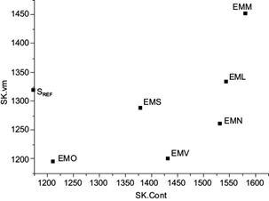 La figura 8 representa la suma de los flujos de las entropías de las variables meteorológicas (temperatura T, humedad relativa HR y magnitud de la velocidad del viento VV) versus los flujos de entropías de cada contaminante, SK,cont, construidas a partir de los datos de las mediciones realizadas por las seis estaciones de monitoreo (PM2.5 + CO + PM10). Además, en esta misma figura se aprecia la conformación de una banda de flujo entrópico con rango vertical: 1.223 - 1.505 para la entropía de las variables meteorológicas (SK,VM) y rango horizontal desde 1.290 a 1.651 para el flujo de entropía de los contaminantes (SK,cont).