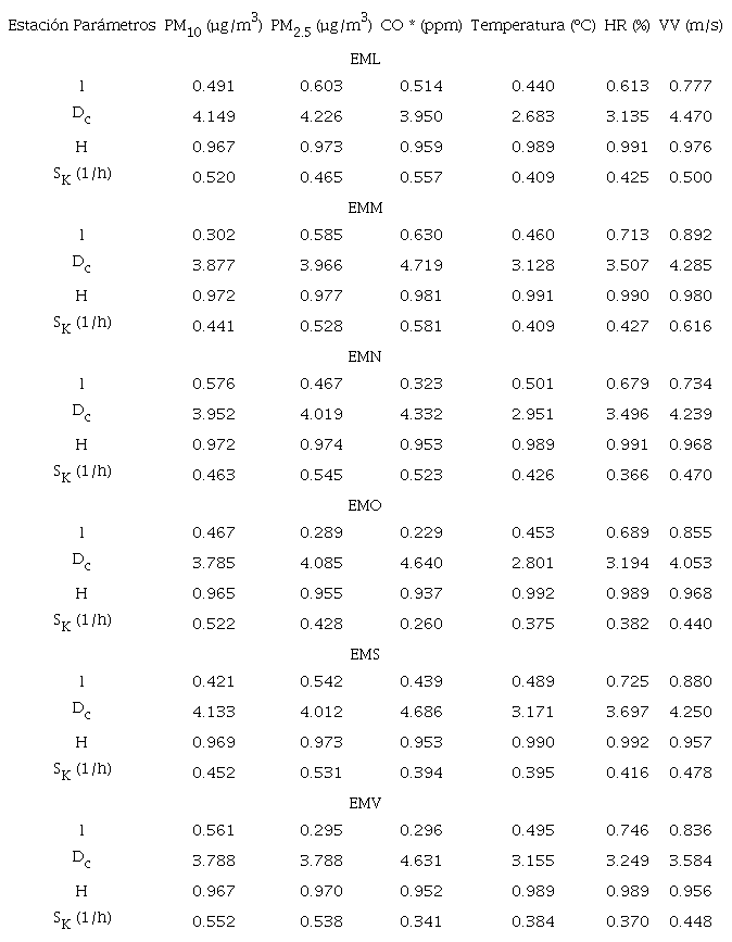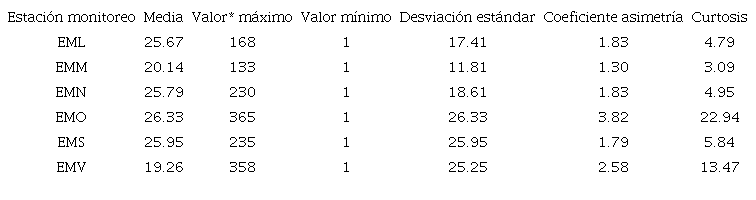 El cuadro I presenta la estadística descriptiva de las seis estaciones de monitoreo para concentraciones horarias de partículas PM2,5 en todo el período en estudio.