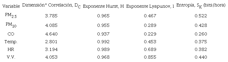 Uno de los objetivos de esta investigación es examinar el comportamiento (determinista, caótico o aleatorio) de tres series de tiempo de contaminantes (PM10, PM2.5 y CO) y de tres series temporales de variables meteorológicas (magnitud de la velocidad del viento, humedad relativa y temperatura). Sin embargo, este estudio demuestra que las series de tiempo de concentraciones de PM10/PM2.5 y CO son caóticas. Lo mismo sucede para las series de tiempo de las variables meteorológicas. Los índices (o cantidades métricas) más importantes en el análisis de series de tiempo no lineales son: tiempo de rezago, τ; dimensión de encajamiento, m; máximo exponente positivo de Lyapunov, λ; dimensión de correlación, DC; entropía de Kolmogorov SK y el exponente de Hurst, H, que permiten cuantificar el grado de caos del sistema. Entonces, si la dimensión de correlación está bajo 5.0, el exponente de Lyapunov es positivo y la entropía de Kolmogorov tiene un valor finito y positivo. así el caos estaría presente en las series temporales en estudio. La entropía de Kolmogorov SK, caracteriza el grado de caos para un sistema no lineal. Este valor es proporcional a la tasa de pérdida de la información del sistema.