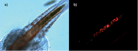 La potencial toxigenicidad de Microcystis (cepas Mc17C2 y Mc17C3) se investigó por medio de bioensayos de mortalidad del crustáceo Artemia sp. (Vanhaecke et al. 1981). Artemia sp. se cultivó eclosionando quistes comerciales según el método propuesto por Sorgeloos et al. (1986). Antes del cultivo se filtró (0.7 µm) y esterilizó agua de mar con una salinidad de 34 UPS. Los quistes eclosionaron en agua de mar diluida (salinidad 27 UPS) a temperatura de 25 ºC (± 2), con un fotoperiodo de 12 h luz:12 h oscuridad. En los bioensayos se usaron individuos juveniles de Artemia sp. con la boca y el sistema digestivo desarrollados. Antes de los bioensayos se confirmó la ingestión de células vivas de Microcystis a través de microscopía de epifluorescencia (Fig. 1 ). Todos los bioensayos se realizaron en la oscuridad para no alterar la abundancia celular de Microcystis, a temperatura de 23 a 26 ºC. Como control experimental negativo, Artemia sp. fue alimentada con microalgas no tóxicas de los géneros Scenedesmus y Pseudokirchneriella. El rango de abundancia y la cepa de Microcystis expuesta como alimento a Artemia se describen en el cuadro I. Los controles negativos y las pruebas experimentales de alimentación se realizaron por sextuplicado en todos los casos. Los bioensayos se realizaron en frascos de cristal (8 mL) con un volumen de 5 mL de agua marina diluida (salinidad 27 UPS), donde un organismo de Artemia se alimentó con la abundancia señalada en el cuadro I. El gradiente de abundancia empleado en los bioensayos se realizó por dilución (agua de mar y cultivo de Microcystis), donde se conservó una salinidad de 27 UPS en todos los casos. La mortalidad se cuantificó a las 24, 48 y 72 h en todos los bioensayos.
