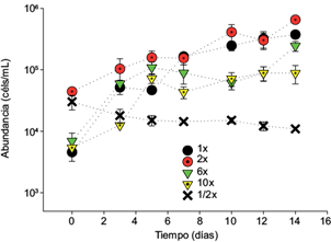 Los experimentos de crecimiento (1/2 ×, 1 ×, 2 ×, 6 × y 10 ×) se realizaron por triplicado en matraces Erlenmeyer (1 L) con un volumen inicial de 700 mL. El crecimiento se evaluó durante 15 días en las condiciones físicas descritas. Los cultivos experimentales iniciaron con abundancias celulares de 104 cel/mL. El crecimiento de Microcystis se cuantificó usando un microscopio compuesto (Zeiss Standard 25) y cámara de Neubauer (Guillard y Sieracki 2005) cada dos días. La tasa de crecimiento se calculó con base en la pendiente de una regresión lineal transformando a logaritmo natural los datos de abundancia de la fase del crecimiento exponencial (Wood et al. 2005).