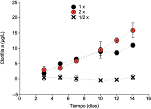 La producción de clorofila a durante el crecimiento de Microcystis no mostró diferencias significativas en los medios 1 × y 2 ×, donde el máximo registrado fue de 11.0 µg cl a/L y 15.8 µg cl a/L (Fig. 3), respectivamente.