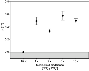 Se utilizó la cepa Mc17C3 para evaluar el efecto de un gradiente de concentración de Ntotal (1.47-29.40 nM) y Ptotal (0.86-17.21 nM) sobre el crecimiento. El medio basal Bold (Ntotal = 2.94 mM y Ptotal = 1.72 mM [Andersen et al. 2005]) se utilizó como referencia estándar en las combinaciones de N y P empleadas para el crecimiento de Microcystis. En este sentido, la combinación de nutrientes asignada a los cultivos experimentales de Microcystis se denominó 1/2 ×, 1 ×, 2 ×, 6 × y 10 × (submúltiplos y múltiplos del valor de N y P agregado a los cultivos considerando el contenido del medio basal Bold).