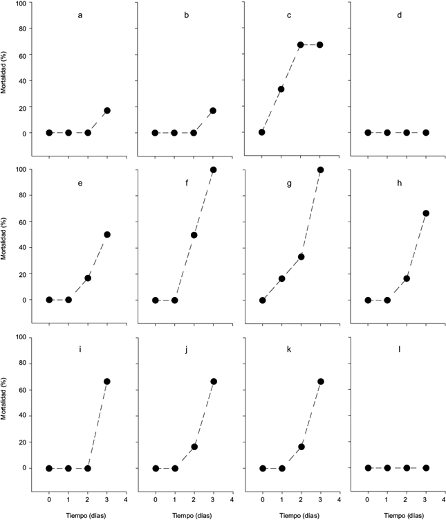 Los datos de abundancia, tasa de crecimiento y concentración de clorofila a se promediaron y graficaron con el programa SigmaPlot (v. 13, Systat Sofware, San Jose, CA, EUA). Además, se graficó el porcentaje de mortalidad de Artemia sp. (n = 4) de los controles y de los tratamientos con alimentación a las 24, 48 y 72 h. Las tasas de crecimiento determinadas en diferentes concentraciones de nutrimentos (1/2 ×,1 ×, 2 ×, 6 × y 10 ×) se analizaron estadísticamente mediante un análisis de varianza (ANOVA) de una vía (SigmaPlot 13). Previamente se realizaron las pruebas de normalidad (Shapiro-Wilk) y homocedasticidad que confirmaron las condiciones de parametricidad de los datos de crecimiento. El valor de significancia (p) de las pruebas estadísticas fue de 0.05.